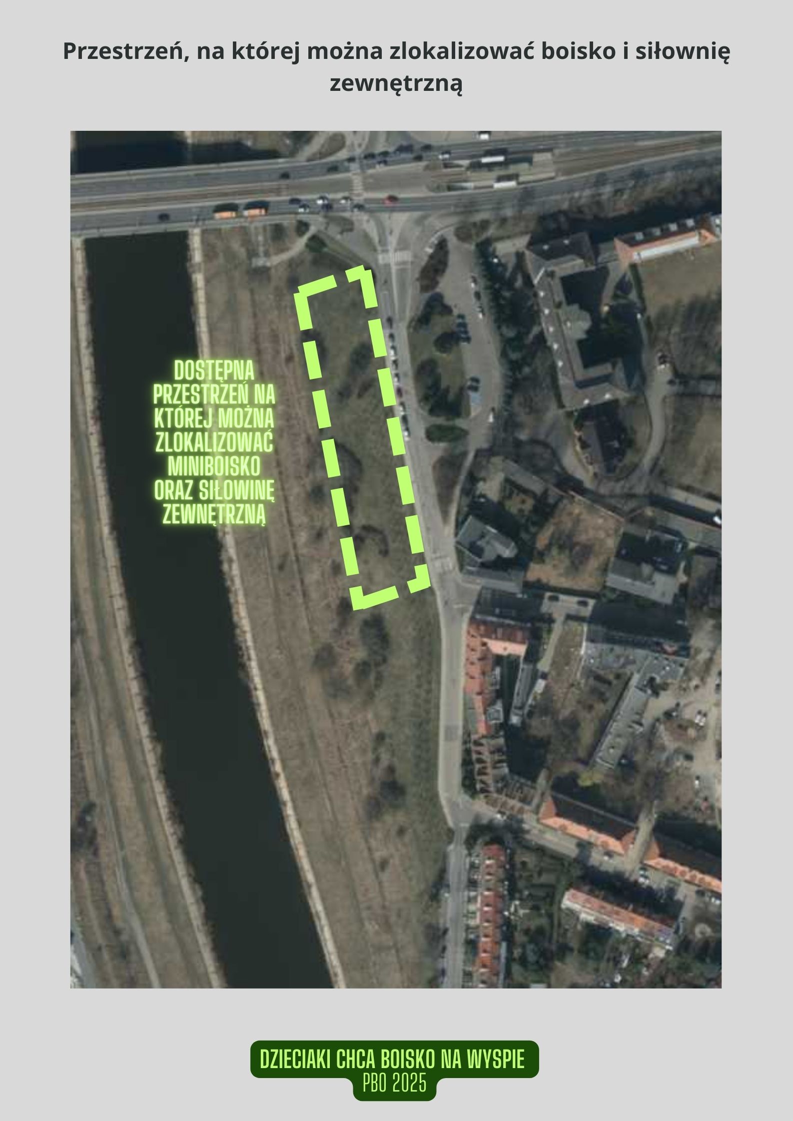 Projekt nie narzuca dokładnej lokalizacji, wielkości ani rodzaju boiska, bo to określone zostanie na etapie realizacji projektu mając na uwadze lokalne warunki - istotne jest samo stworzenie takiej przestrzeni. Dobry przykład to małe boisko do gry w koszykówkę w starym korycie Warty przy ulicy Mostowej (w pobliżu pawilonu Nowe Gazowni).