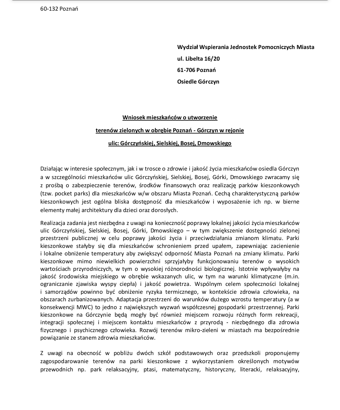 Uzasadnienie Miejska Pracownia Urbanistyczna w Poznaniu informuję, że zgłoszenia do PBO25 opiniuje w zakresie zapisów projektów mpzp. Większość lokalizacji wskazanych we wniosku znajduje się na terenach objętych granicami sporządzanego projektu mpzp „Rejon Górczyna - część B” w Poznaniu (uchwała nr L/760/VI/2013 Rady Miasta Poznania z dnia 21 maja 2013 roku w sprawie przystąpienia do sporządzenia miejscowego planu zagospodarowania przestrzennego „Rejon Górczyna” w Poznaniu – opracowanie zostało podzielone na części A i B w toku prac planistycznych). Prace nad projektem ww. planu znajdują się na wczesnym etapie procedury planistycznej (przed opiniowaniem oraz drugim etapem konsultacji społecznych). Prace te zostały zawieszone po wydzieleniu części A i nie została ukończona część graficzna, jak również nie ma ustaleń tekstowych. Ponieważ projekt planu „Rejon Górczyna – część B” w Poznaniu nie przeszedł procedury formalno-prawnej, jego ustalenia mogą ulec zmianom. Nie wyklucza się zatem wyznaczenia terenów zieleni urządzonej na wybranych działkach. Niemniej w przypadku działek nr 80/2, 85, 106 i 107, a także nr 105/2, informujemy, że w dotychczasowych założeniach projektowych działki te znajdowały się w liniach rozgraniczających terenów zabudowy mieszkaniowej wielorodzinnej lub usługowej MW/U. Jednocześnie informujemy, że dla działki nr 85 (ul. Bosa 13) złożony został wniosek „Stowarzyszenia na rzecz dzieci z dysfunkcjami neurorozwojowymi Intuicja” o ustalenie warunków zabudowy dla budynku oświaty z dopuszczeniem funkcji zdrowotnej (procedowany w WUiA UMP). W przypadku lokalizacji nr 3 (narożnik ulic Górczyńskiej i Jarachowskiego) trzeba wziąć pod uwagę zapisy obowiązującego mpzp „Rejon Górczyna – część A” w Poznaniu (uchwała nr XXXIV/571/VII/2016 Rady Miasta Poznania z dnia 6 września 2016 roku), a realizacja zamierzeń projektowych w tym miejscu może wiązać się z likwidacją istniejącego parkingu. Natomiast w przypadku lokalizacji nr 8 (niezagospodarowany pas wzdłuż ulicy Dmowskiego) należy wziąć pod uwagę zapisy obowiązującego mpzp „W rejonie ulic R. Dmowskiego i Góreckiej” w Poznaniu (uchwała nr XCI/1741/VIII/2023 Rady Miasta Poznania z dnia 24 października 2023 roku), który w bezpośrednim sąsiedztwie wskazuje przebieg drogi lokalnej (1 KDL).
