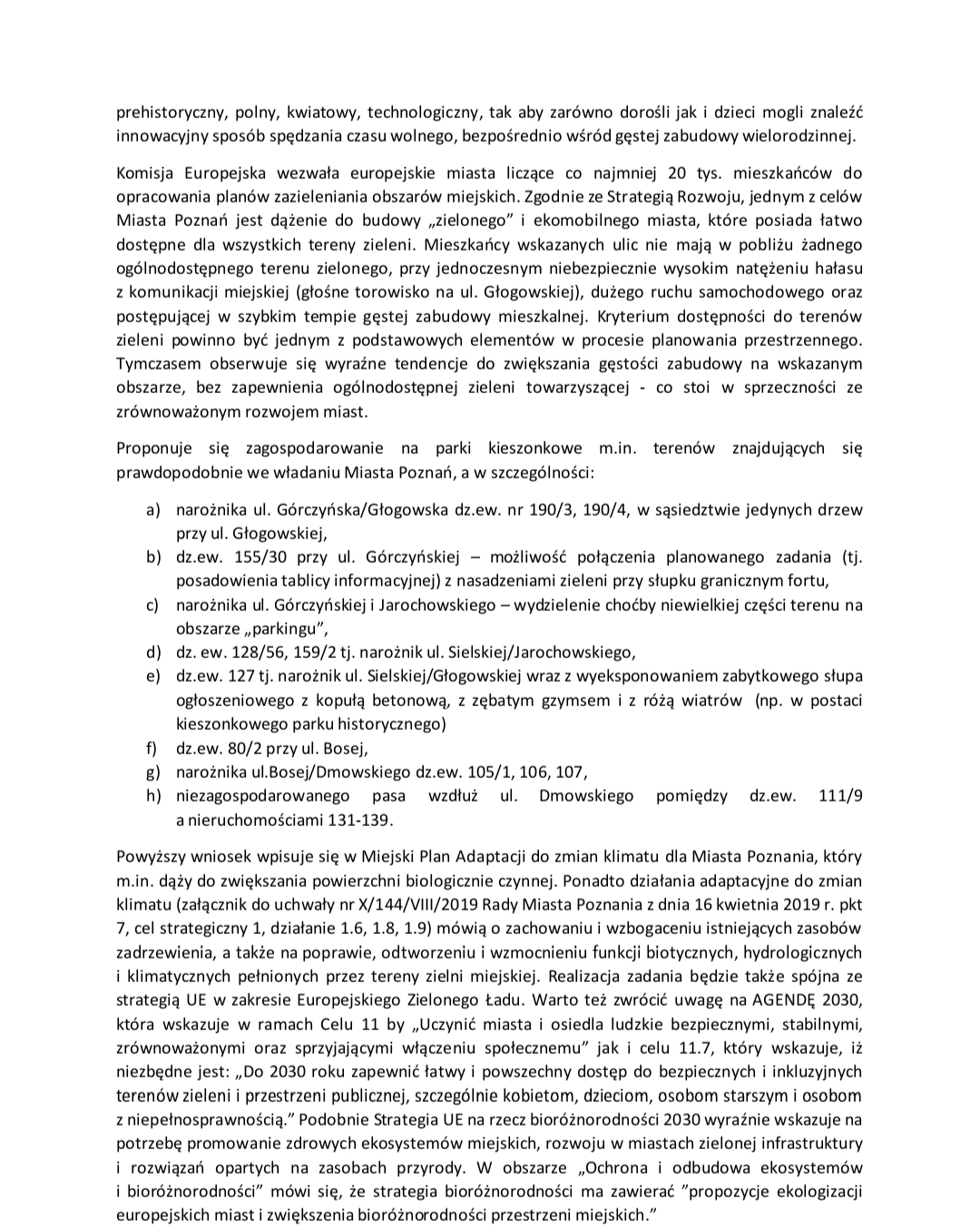 Uzasadnienie Lokalizacje: 1) narożnik ul. Górczyńska/Głogowska działki nr 190/3, 190/4 - TAK Teren nie jest objety miejscowym planem zagospodarowania przestrzennego, ale dla terenu sporządzany jest mpzp "Rejon Górczyna - część B" w Poznaniu Działka nr 190/3 – klasouzytek dr Działka nr 190/4 – klasouzytek B Działki są własnością Miasta Poznania, niezbędna opinia WGN, ZDM i MPU 2) działka 55/130 - TAK Teren nie jest objety miejscowym planem zagospodarowania przestrzennego, ale dla terenu sporządzany jest mpzp "Rejon Górczyna - część B" w Poznaniu. Działka stanowi część pasa drogowego ul. Górczyńskiej i jest obecnie użytkowana jako chodnik. działka 55/130 – klasouzytek dr Działka jest własnością Miasta Poznania, niezbędna opinia WGN, ZDM i MPU 3) narożnik ul. Górczewskiej i Jarochowskiego – teren parkingu TAK Teren jest objety miejscowym planem zagospodarowania przestrzennego Rejon Górczyna - część A w Poznaniu i oznaczony symbolem 2 KDWpp - tereny dróg wewnętrznych i 4 KD-D tereny dróg publicznych. - zgodnie z § 5, ust. 2) W zakresie zasad ochrony środowiska, przyrody i krajobrazu kulturowego ustala się: nakaz zagospodarowania zielenią wszystkich powierzchni wolnych od utwardzenia; § 5, ust.4) W zakresie zasad ochrony środowiska, przyrody i krajobrazu kulturowego ustala się: na terenach komunikacji zachowanie i uzupełnienie istniejących zadrzewień, przy czym przy przebudowie układu drogowego dopuszcza się wycięcie lub przesadzenie drzew kolidujących z tą inwestycją, a nowe nasadzenia drzew w pasie drogowym dopuszcza się pod warunkiem, że nie koliduje to z parametrami drogi i infrastrukturą techniczną 4) narożnik ul. Sielskiej i Jarochowskiego działka 128/56 i 159/2 - TAK Teren nie jest objety miejscowym planem zagospodarowania przestrzennego, ale dla terenu sporządzany jest mpzp "Rejon Górczyna - część B" w Poznaniu. Działka nr 128/56 – klasoużytek dr, stanowi część pasa drogowego ul. Sielskiej i na jej terenie urządzone są miejsca postojowe Działka 159/2 – klasouzytek B, działka częściowo zabudowa Działki są własnością Miasta Poznania, niezbędna opinia WGN, ZDM i MPU 5) narożnik ul. Sielskiej i Głogowskiej działka 127 - TAK Teren nie jest objety miejscowym planem zagospodarowania przestrzennego, ale dla terenu sporządzany jest mpzp "Rejon Górczyna - część B" w Poznaniu. Działka nr 127 – klasoużytek B, działka częściowo zabudowana budynkiem handlowym, na tyłach zlokalizowany jest parking Słup zabytkowy zlokalizowany jest na działce 1/3, stanowiącej część pasa drogowego ul. Głogowskiej Działki są własnością Miasta Poznania, niezbędna opinia WGN, ZDM i MPU 6) działka 80/2 - NIE Teren nie jest objety miejscowym planem zagospodarowania przestrzennego, ale dla terenu sporządzany jest mpzp "Rejon Górczyna - część B" w Poznaniu. Działka stanowi część terenu Szkoły Podstawowej nr 10 im. Arkadego Fiedlera i nie jest ogólnodostępnym terenem. działka 55/130 – klasouzytek dr Działka jest własnością Miasta Poznania 7) narożnik ul. Bosej/Dmowskiego dz. nr 105/1, 106, 107 - TAK Działka 105/1– klasouzytek dr - Teren jest objety miejscowym planem zagospodarowania przestrzennego „W rejonie ulic R. Dmowskiego i Góreckiej w Poznaniu” - działka oznaczona symbolem 1KD-L – teren dróg publicznych - zgodnie z § 5, ust. 1) W zakresie zasad ochrony środowiska, przyrody i krajobrazu kulturowego ustala się: nakaz zagospodarowania zielenią wszystkich powierzchni wolnych od utwardzenia; § 5, ust.2) W zakresie zasad ochrony środowiska, przyrody i krajobrazu kulturowego ustala się: zachowanie istniejących drzew, a w przypadku kolizji z planowaną infrastrukturą lub zabudową dopuszczenie ich przesadzenia lub usunięcia i wprowadzenia nowych nasadzeń (…) Działka 106 i 107– klasouzytek B Teren nie jest objety miejscowym planem zagospodarowania przestrzennego, ale dla terenu sporządzany jest mpzp "Rejon Górczyna - część B" w Poznaniu. Na działce nr 106 zlokalizowany jest budynek (pustostan), działka nr 107 jest niezabudowana. Działki są własnością Miasta Poznania, niezbędna opinia WGN, ZDM i MPU 8) Działka nr 2 - niezagospodarowany teren pomiędzy dzialką nr 111/9 a nieruchmościami 131- 139 przy ul. Dmowskiego - TAK - Teren jest objety miejscowym planem zagospodarowania przestrzennego „W rejonie ulic R. Dmowskiego i Góreckiej w Poznaniu” - działka oznaczona symbolem 5ZP – tereny zieleni urządzonej - zgodnie z § 6, ust. 1), lit.b) W zakresie zasad ochrony dziedzictwa kulturowego i zabytków, w tym krajobrazów kulturowych, oraz dóbr kultury współczesnej ustala się: na terenach 4ZP i 5ZP w śladzie staroberlińskiej linii kolejowej: zachowanie pozostałości nasypu i torowiska kolejowego oraz innych elementów infrastruktury kolejowej, Działki są własnością Miasta Poznania, niezbędna opinia MKZ i MPU Wnioski: Inwestycja planowana na obszarach nieobjętych mpzp, powinna odbywać się w porozumieniu z zarządcą terenu, szczególnie na terenach klasoużytków