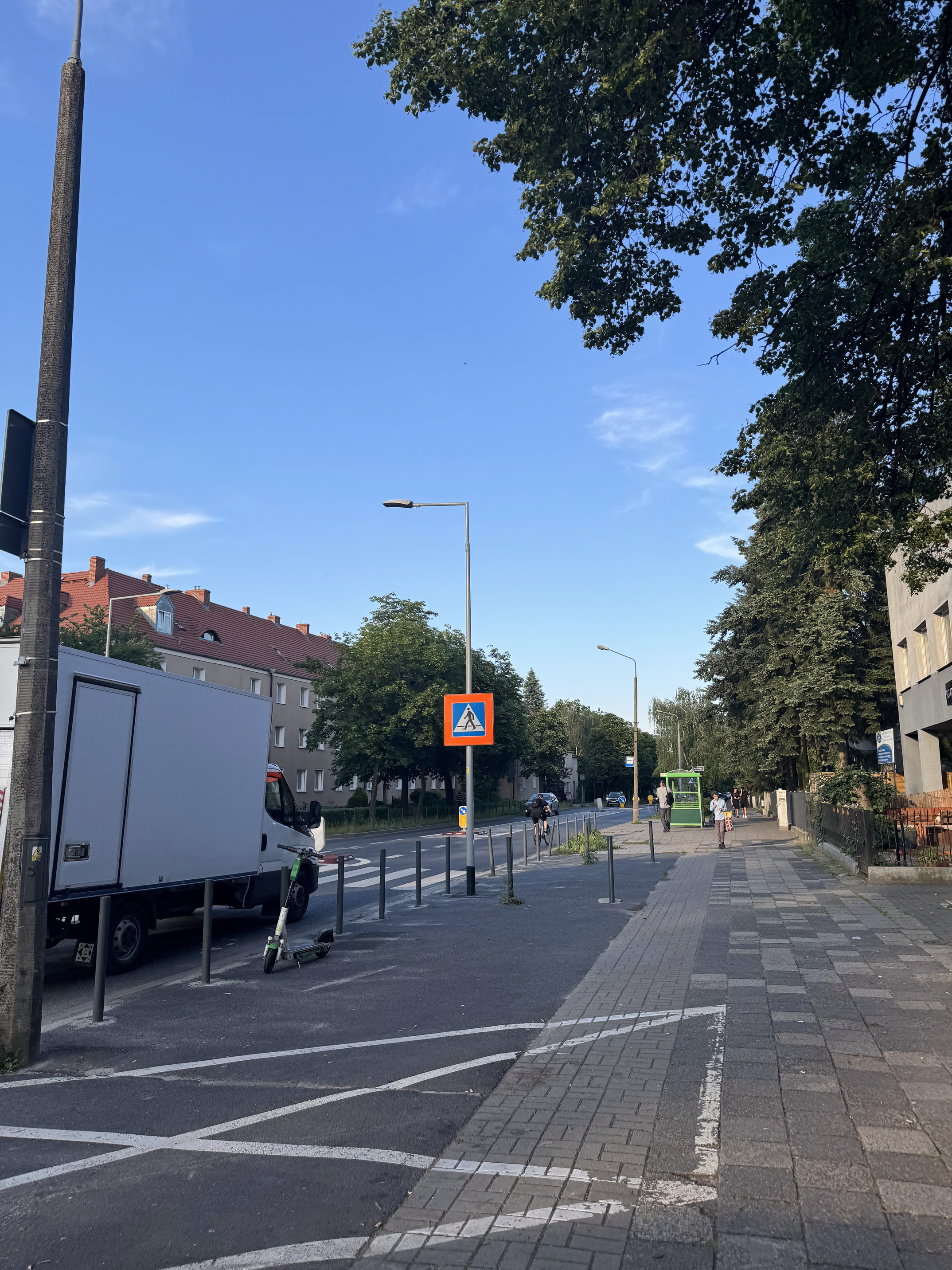 Parę lat temu przy przejściu dla pieszych usunięto miejsca parkingowe poprzez wbicie słupków. Niestety na tym działania się zakończyły, dlatego proponuję odbetonowanie tej strefy. Usunąć beton i słupki, postawić ławki, wsadzić drzewa, zagospodarować niską zieleń, postawić stojaki na rowery. Taka zmiana poprawi także retencje wody w okolicy i całościowy wygląd ulicy Marcelińskiej, ponieważ to jedno z nielicznych miejsc, gdzie nie ma drzew przy drodze.