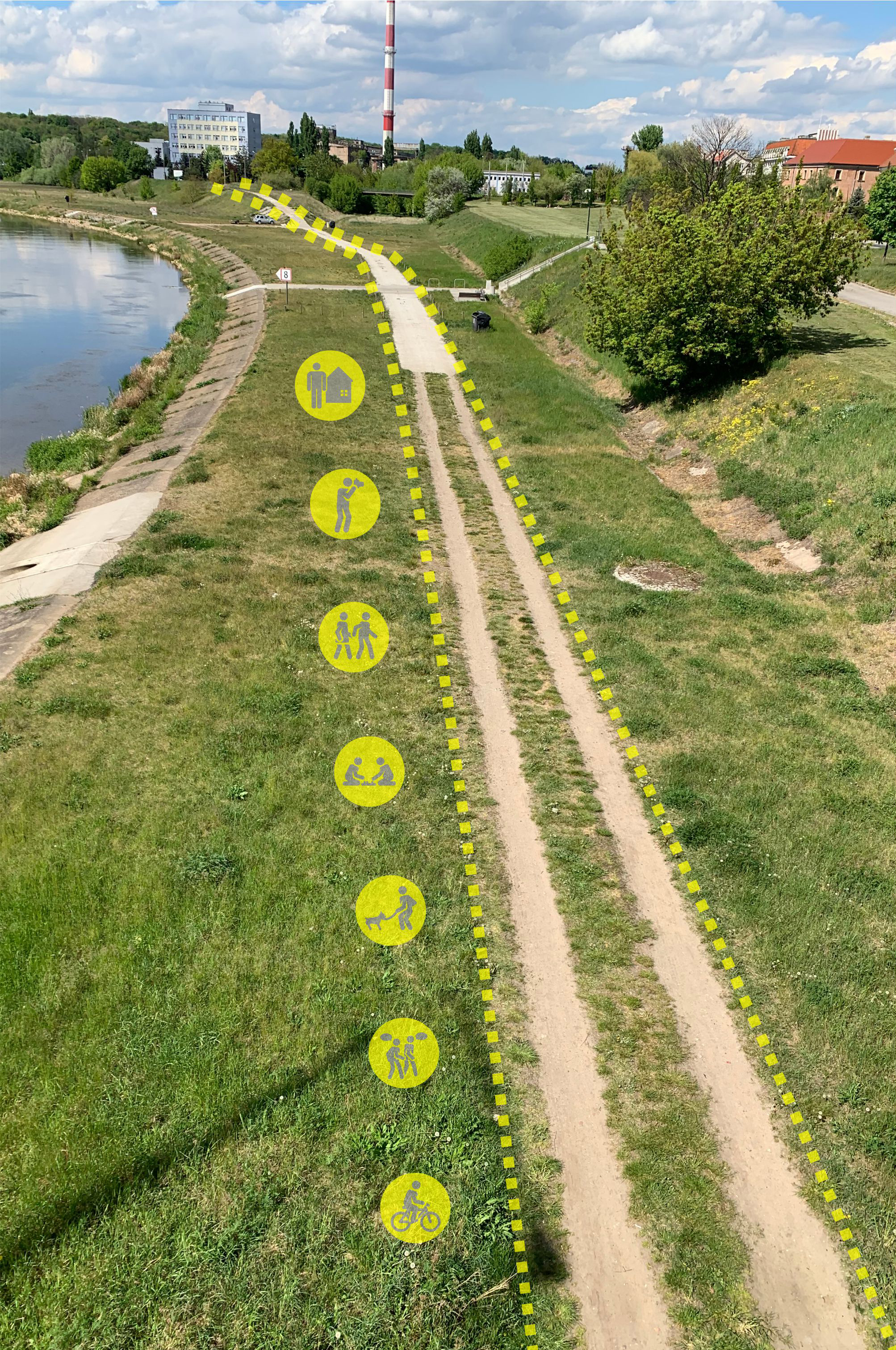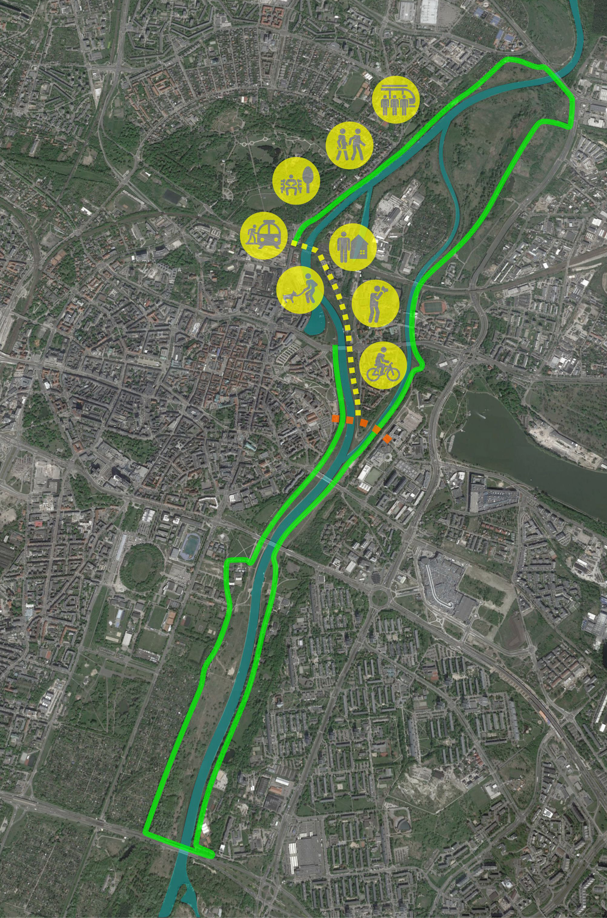 Uzupełnienie realizowanego obecnie projektu Kładki Berdychowskiej o bezpośredni i jedyny zjazd na dolny taras Warty dla osób niepełnosprawnych i rowerzystów.